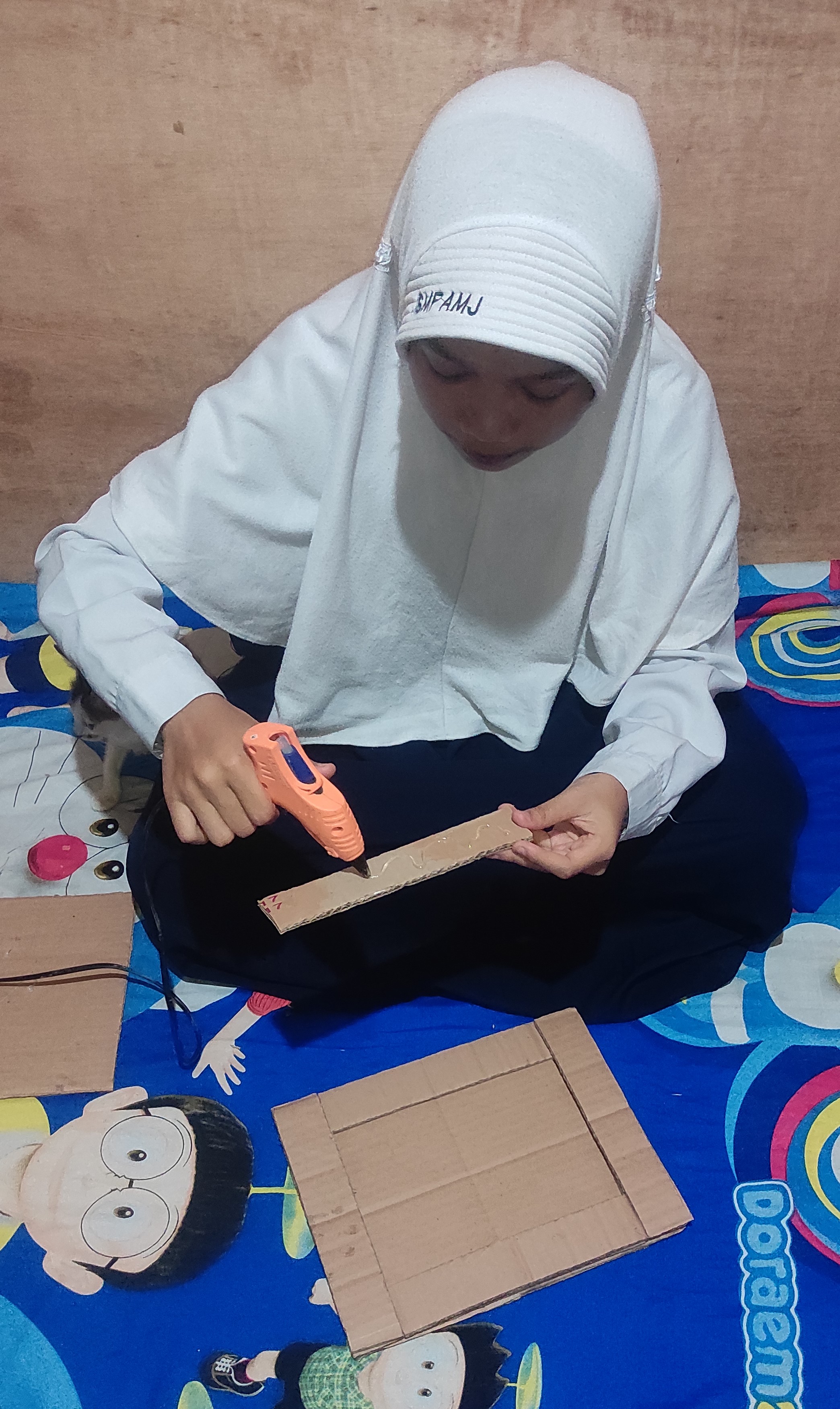 - Hasil potongan kardus tersebut disatukan dengan cara ditempelkan menggunakan lem lilin. Kardus besar menjadi kardus utamanya, sedangkan kardus dengan ukuran yang lebih kecil akan diberi lem lalu ditempelkan di sisi kanan kiri kardus utama, untuk mempercantik bentuk hiasan dindingnya.